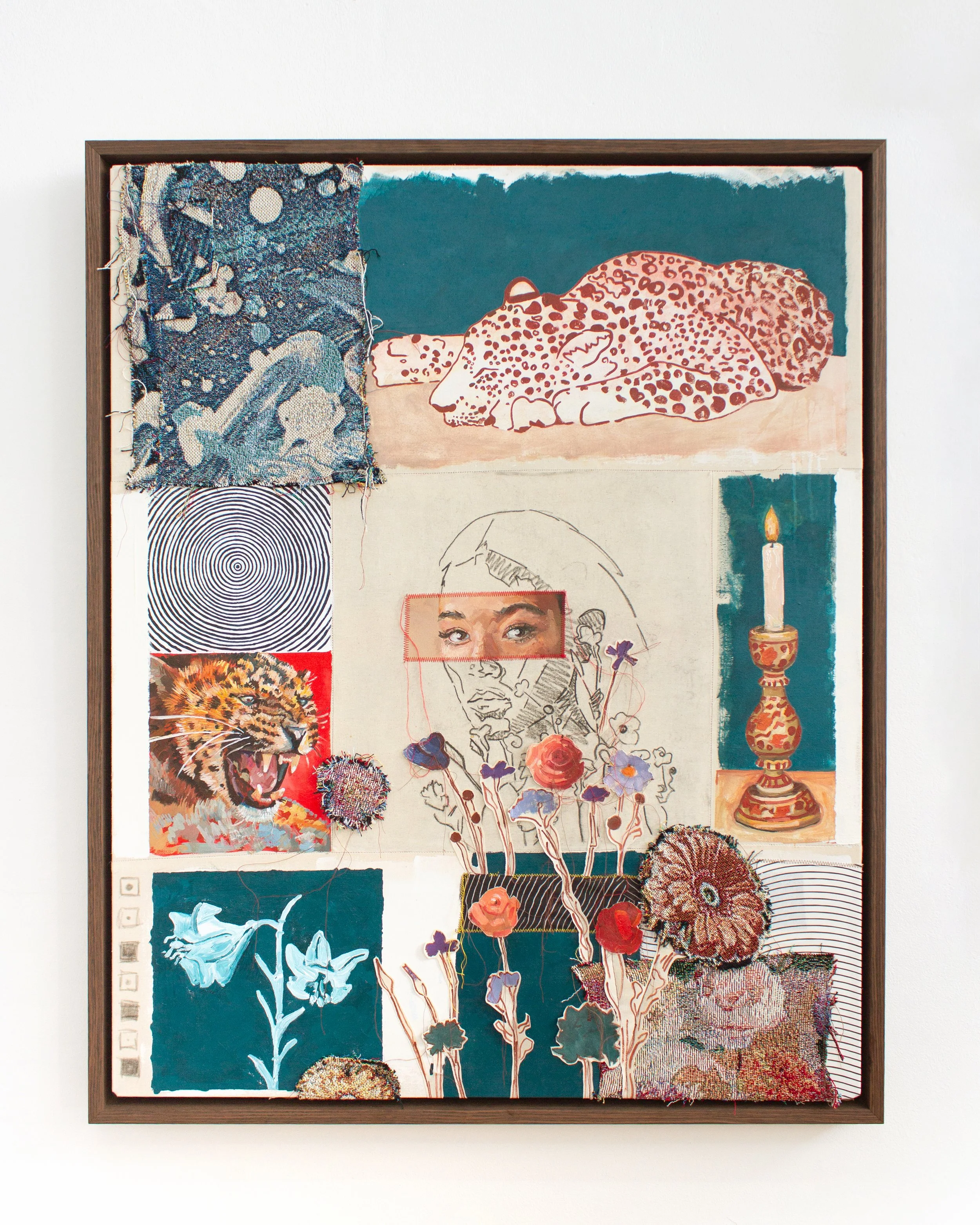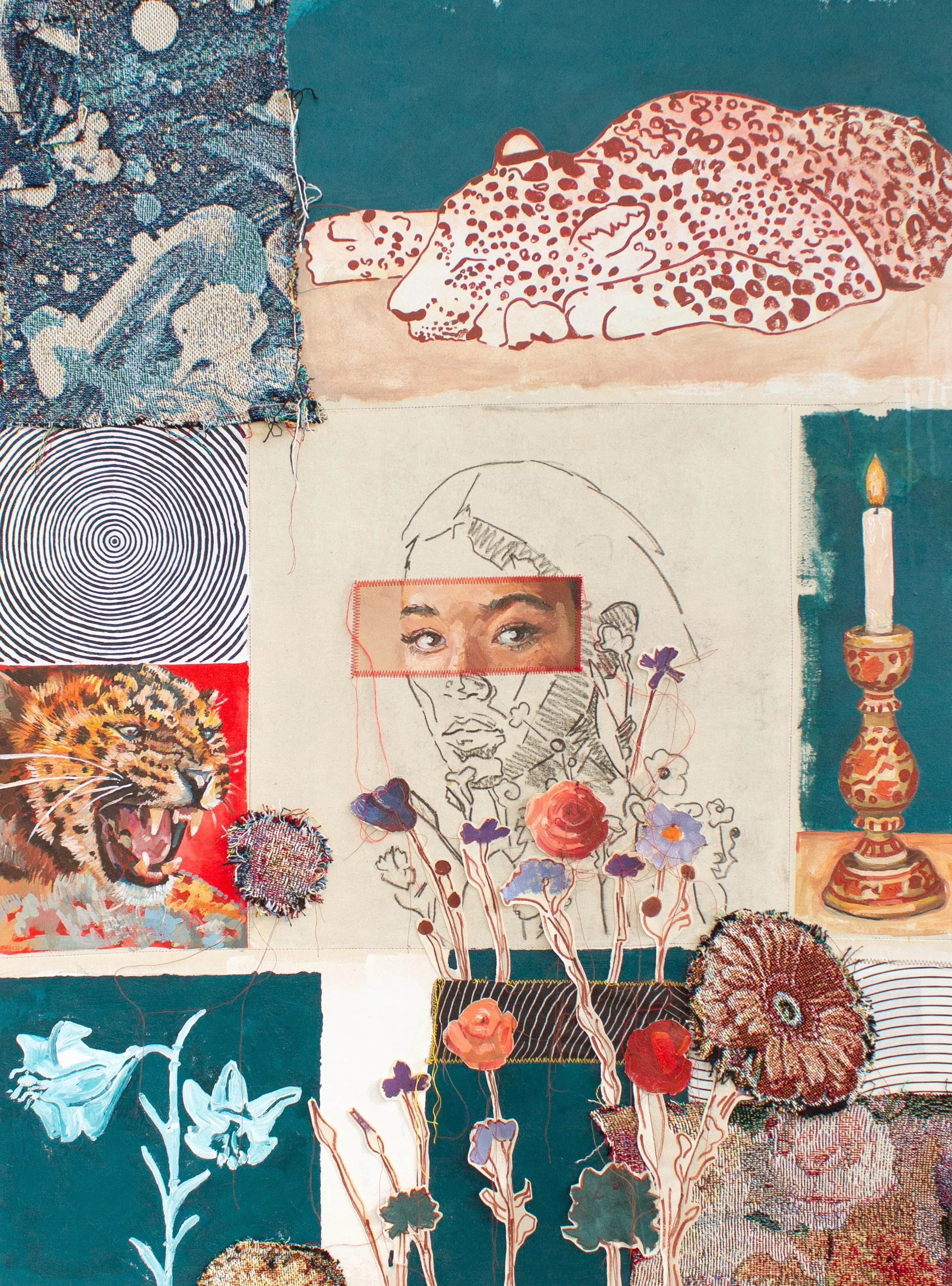 This piece was created using oil and acrylic paint, as well as charcoal on canvas, with woven tapestry detail. I tear up my canvases and bits of painting I make, and I stitch them together with my sewing machine. I also digitally design the sections of tapestry that are woven for me by a weaving studio in the US.