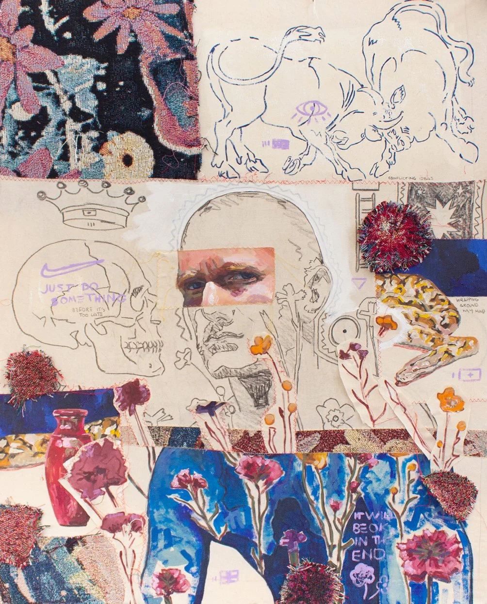 This mixed-media canvas was created by painting several canvases, tearing them up and collaging segments that were then stitched together. The edges of the painting are left loose, and the canvas is left raw to give an unfinished look, reflecting that everyone's life is a work in progress.