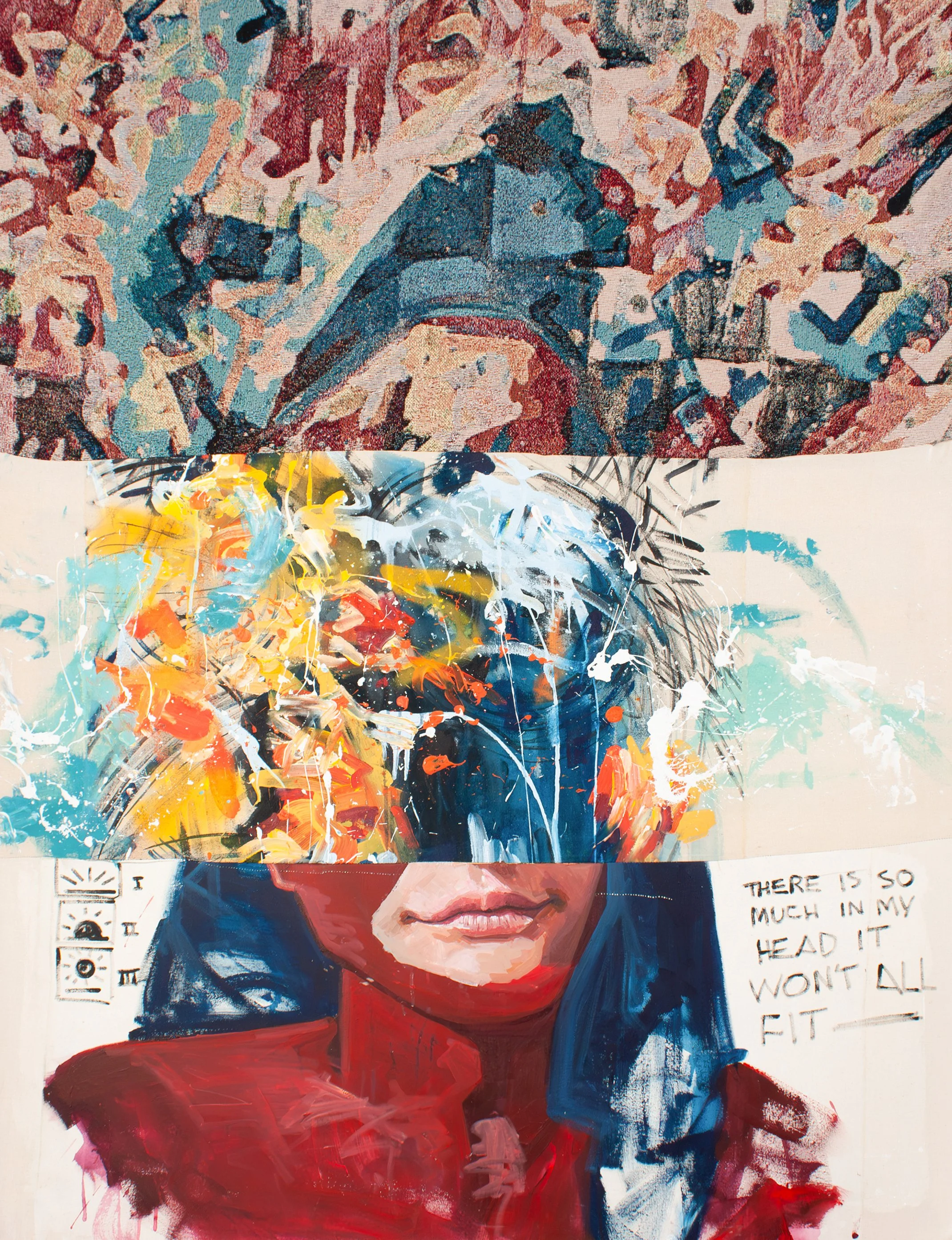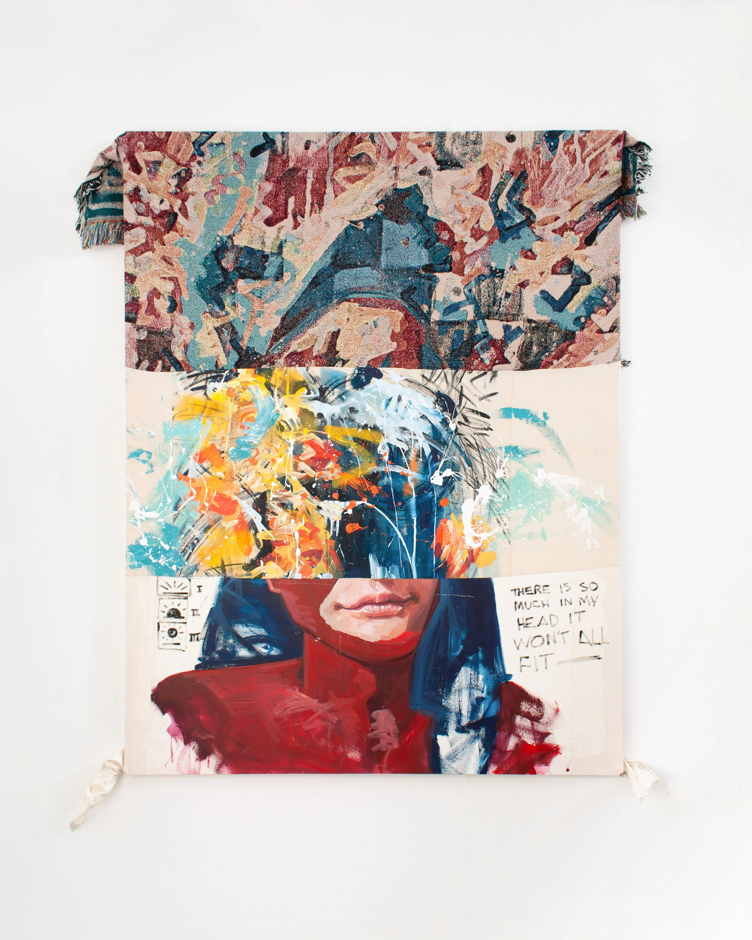 This piece was created using acrylic paint and charcoal on canvas and jacquard tapestry. I tear up my canvases and bits of painting I make, and I stitch them together with my sewing machine. I also digitally design the sections of tapestry that are woven for me by a weaving studio in the US.